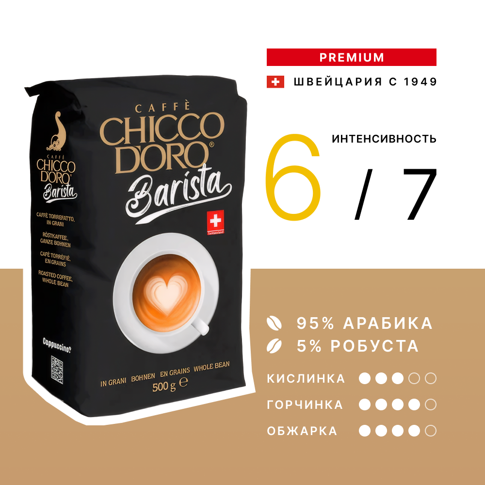 Идеально подходит для приготовления эспрессо, этот кофе порадует вас насыщенным ароматом и стойким послевкусием. Chicco D'oro Barista – это выбор тех, кто ищет крепкий и ароматный кофе для кофемашины, турки или френч-пресса.