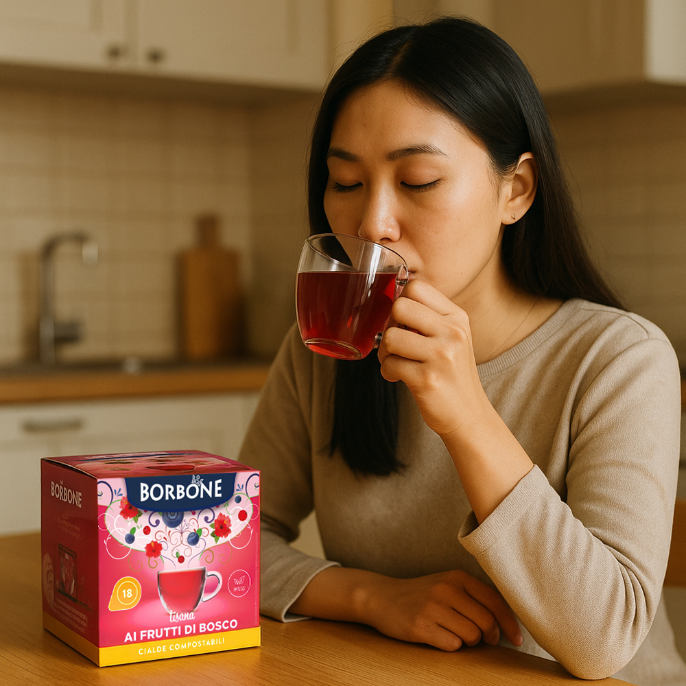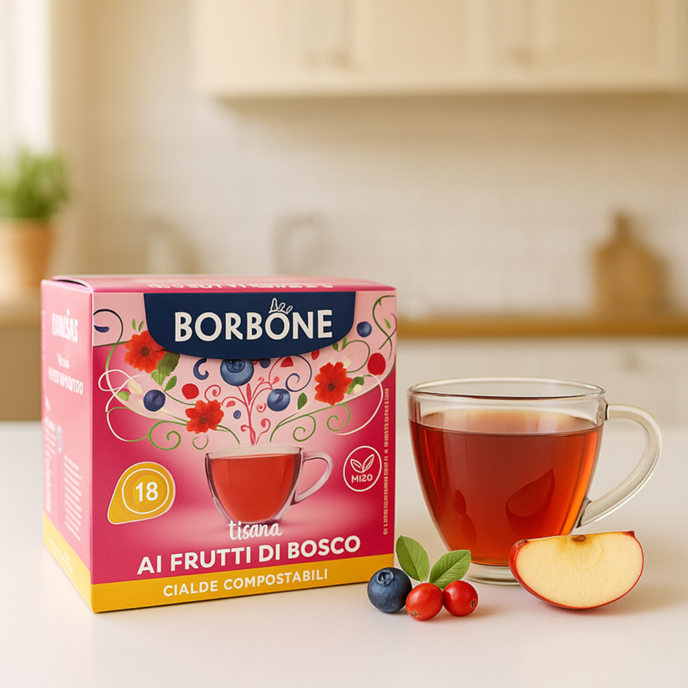 Borbone Infuso ai Frutti – фруктовый чай для создания горячих и холодных напитков. Совместим с кофемашинами, поддерживающими технологию ESE. Натуральный и полезный состав.